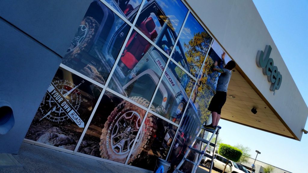 Help your store front stand out from the crowd! We carry a full-line of perforated viynl that gives the appearnce of full-color print, but still allows light to pass through. From the inside, the wrap is hardly noticeable at all!